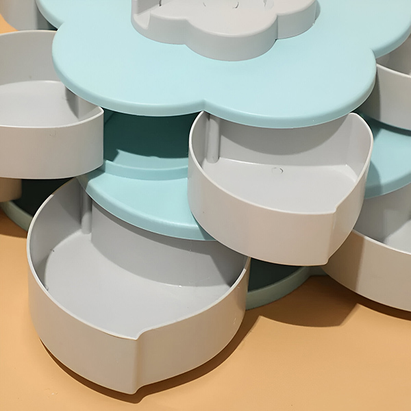 Dviejų sluoksnių saugykla, kuri atsidaro kaip gėlė, leidžia lengvai tvarkyti virtuvę ir taupyti vietą.