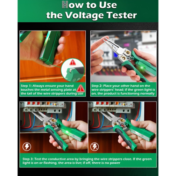 Apima AWG 10, 12, 14, 18 ir nuo 1,0 iki 4,0 mm². Įmontuotas testeris leidžia patvirtinti, kad grandinė išjungta.