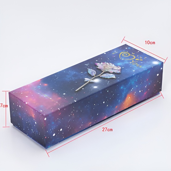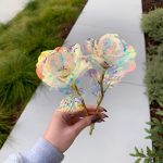 Kiekviena rožė pagaminta su vaivorykštiniu, holografiniu padengimu, kuris nuostabiai spindi šviesoje, sukurdamas galaktiką primenantį spindesį, kuris tiesiog užburia.