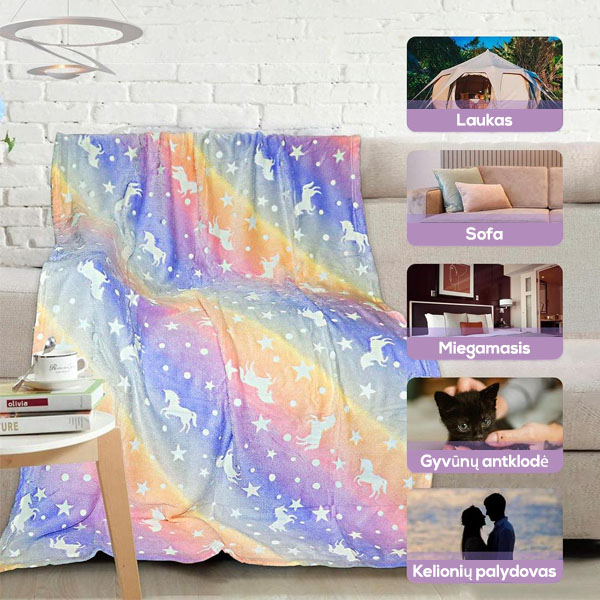 Jauki ir šilta antklodė naktį skleidžia šviesą! Galite pasirinkti vienaragio arba dinozauro raštą!