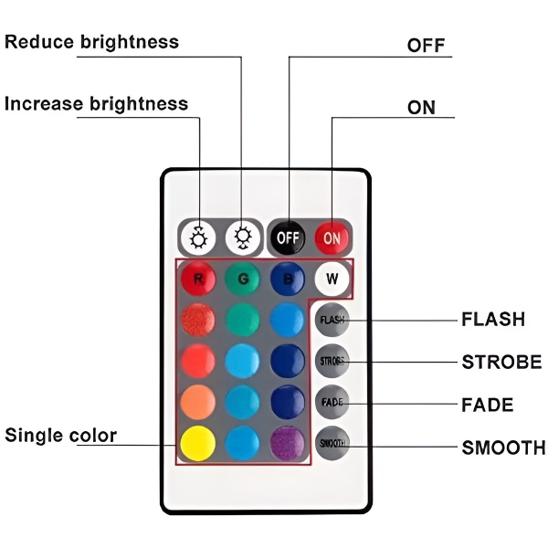 AQUASHEIN komplektuojami su patogiu nuotolinio valdymo pulteliu, kuriuo galėsite lengvai reguliuoti apšvietimą. Naudodami 24 mygtukus galite rinktis iš 16 RGB spalvų ir keturių dinaminių režimų (blyksnis, stroboskopas, išnykimas, nuolatinis). Valdykite apšvietimą iki 10 metrų atstumu, taip užtikrindami nesudėtingą naudojimą.